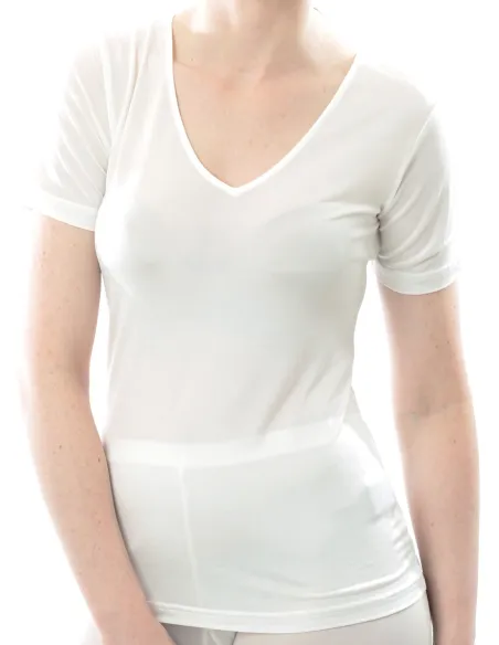 Zijden dames t-shirt met V-hals van Alkena. 100% bio zijde, jersey/interlock. GOTS gecertificeerd.